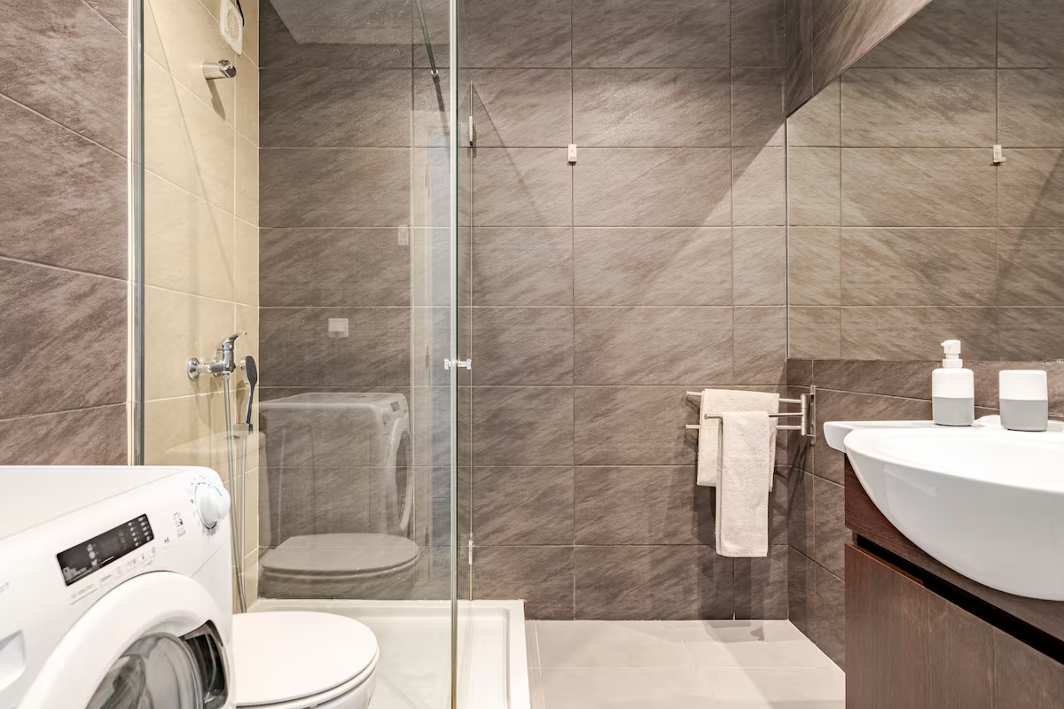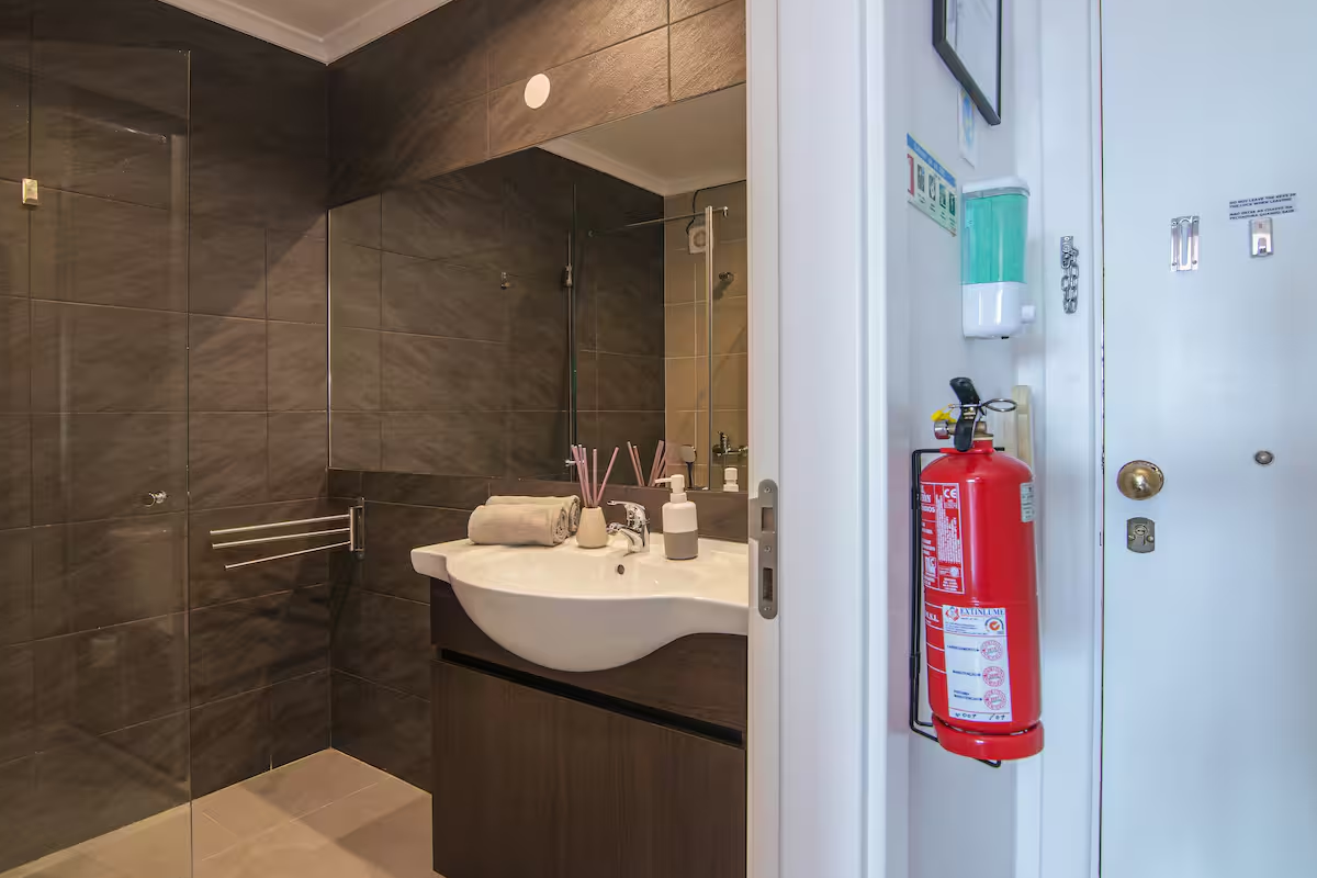 Na casa-de-banho dispõe de lavatório duche e máquina de lavar roupa. Todo o apartamento está seguro com alarme de incêndio e cofre de valores pessoais, de uso gratuito.
